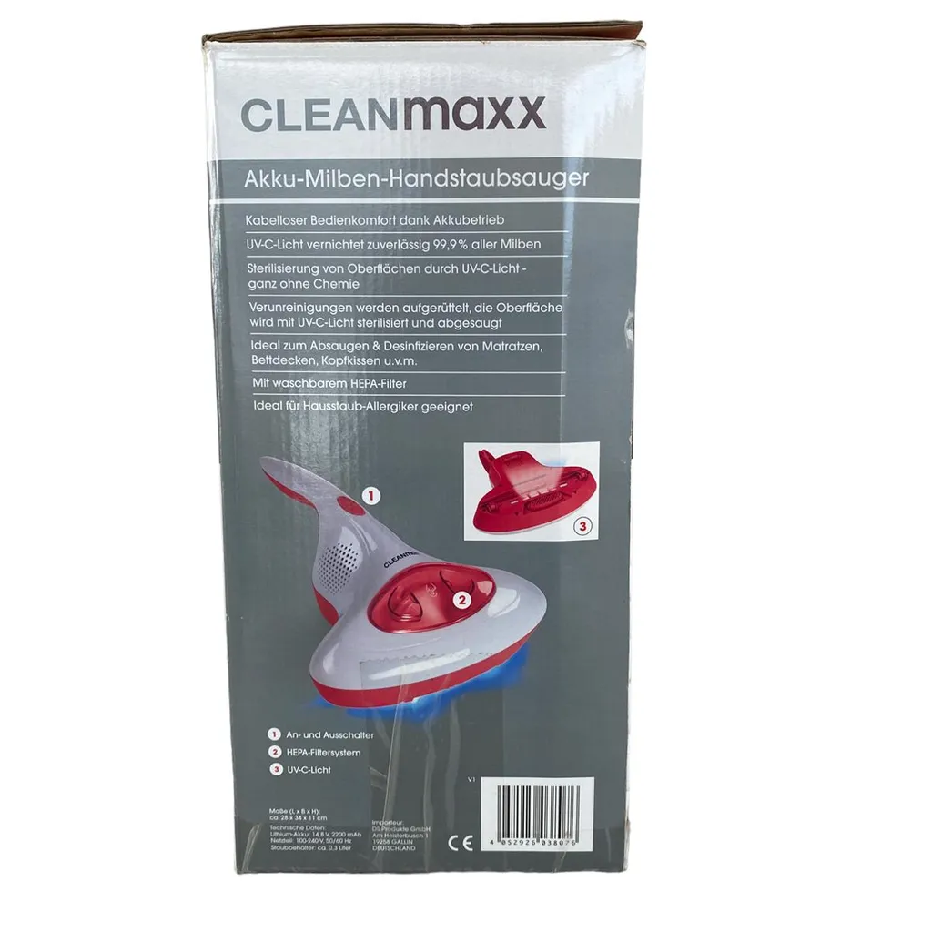 CLEANmaxx Akku-Milben-Handstaubsauger Mit UV-C-Licht – Rot/weiß UV Licht Akku Milbensauger Handstaubsauger Milben Allergiker Kabellos CLEANmaxx