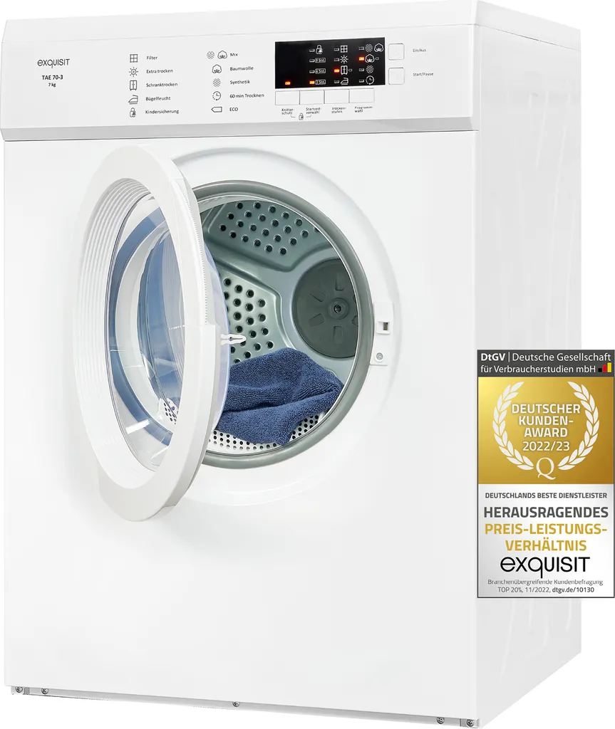 Schreibe die erste Rezension für „Exquisit TAE 70-3 Abluftrockner | 7 Kg | Elektronik | Reversierautomatik | Weiß“ Antwort abbrechen
