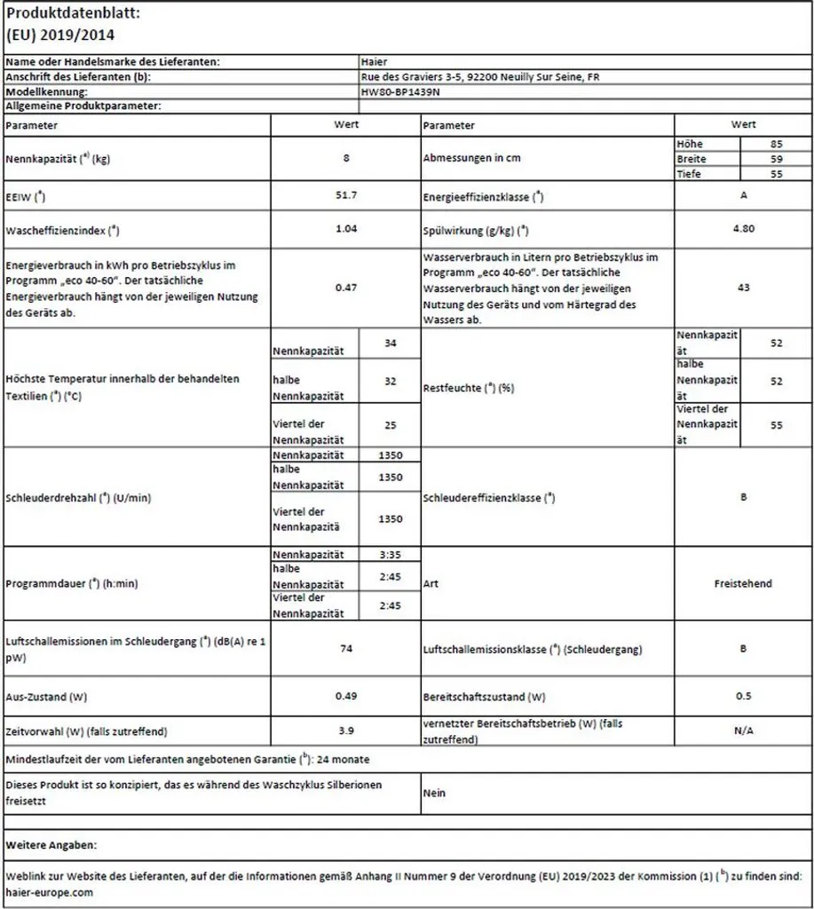 Haier HW80-BP1439N Frontlader Waschmaschine 8 Kg Fassungsvermögen Dampf-Funktion