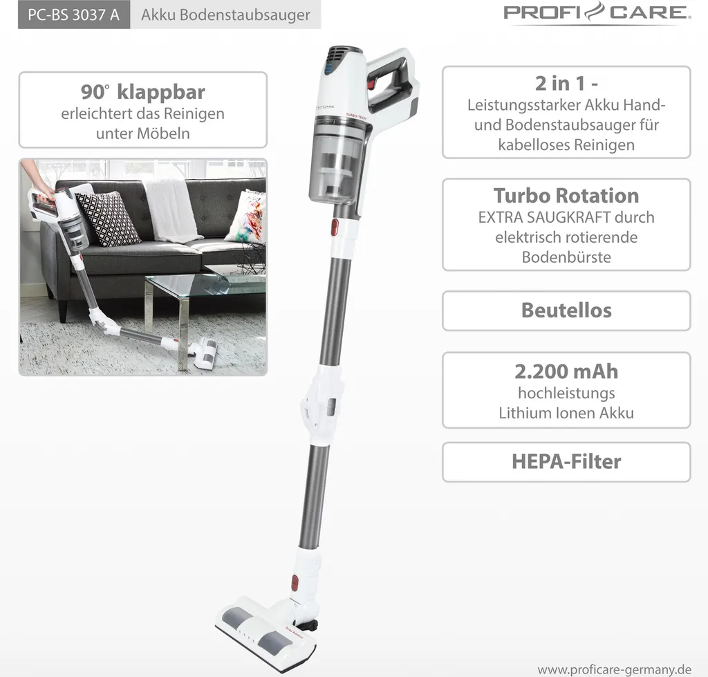 ProfiCare 2in1 Hand-und Bodenstaubsauger PC-BS 3037 A, Leistungsstarker 29.6V Lithium Ionen Akku, Turbo-Modus, Inkl. Wandhalterung Mit Ladefunktion, Weiß-Silber
