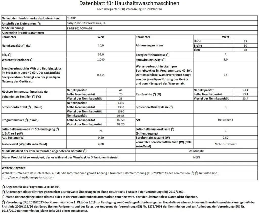 Sharp ES-NFB014CWA-DE Waschmaschine 10 Kg 1400 U/min