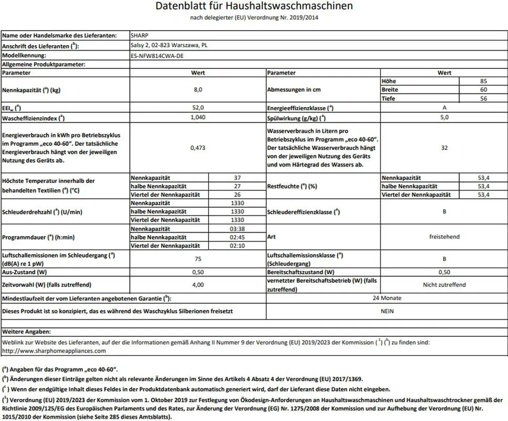 Sharp – ES-NFW814CWA-DE – Waschmaschine – 8 Kg